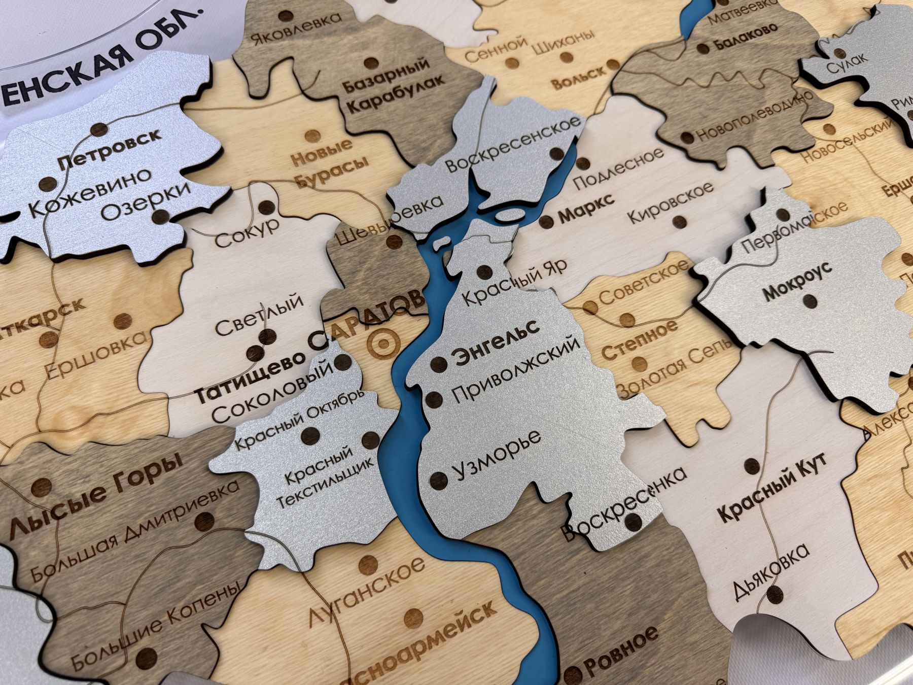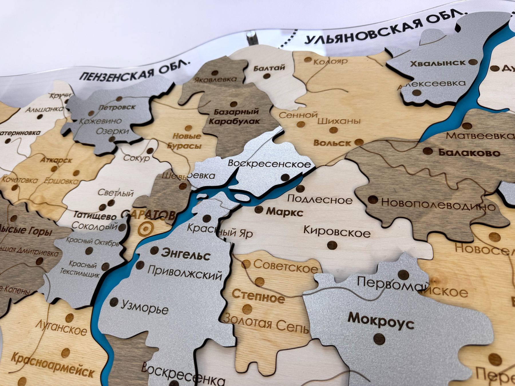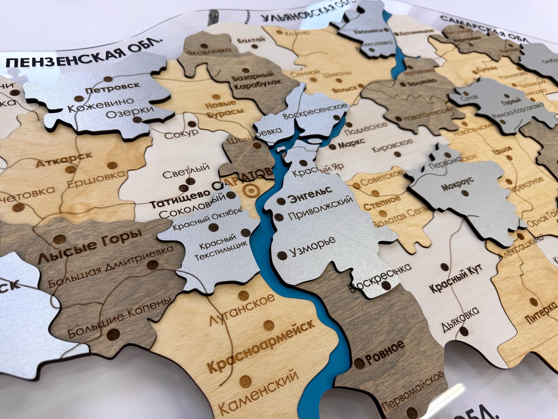 Очередная новинка в нашем каталоге карт регионов России - многоуровневая карта Саратовской области из дерева, на подложке из орг.стекла.