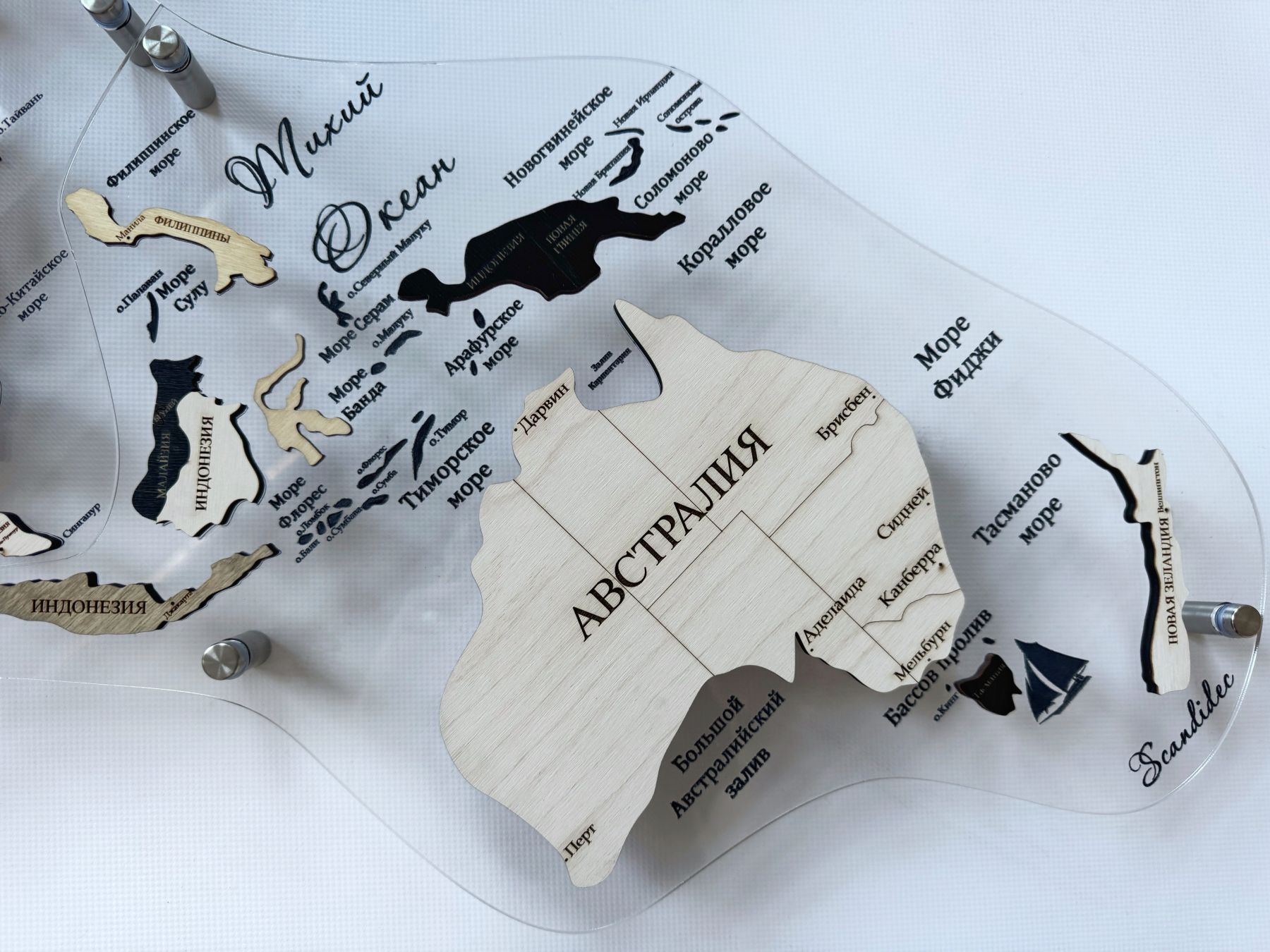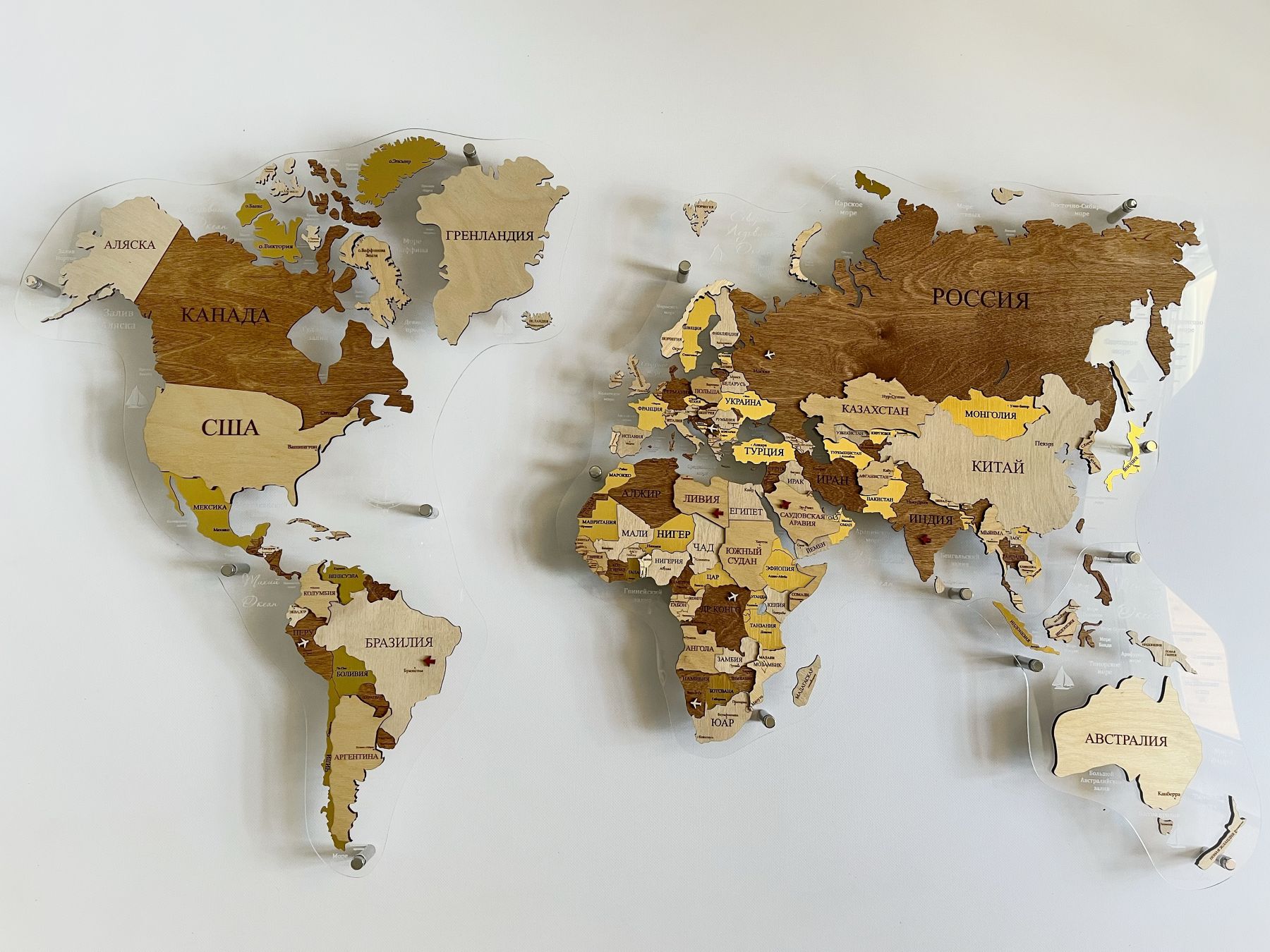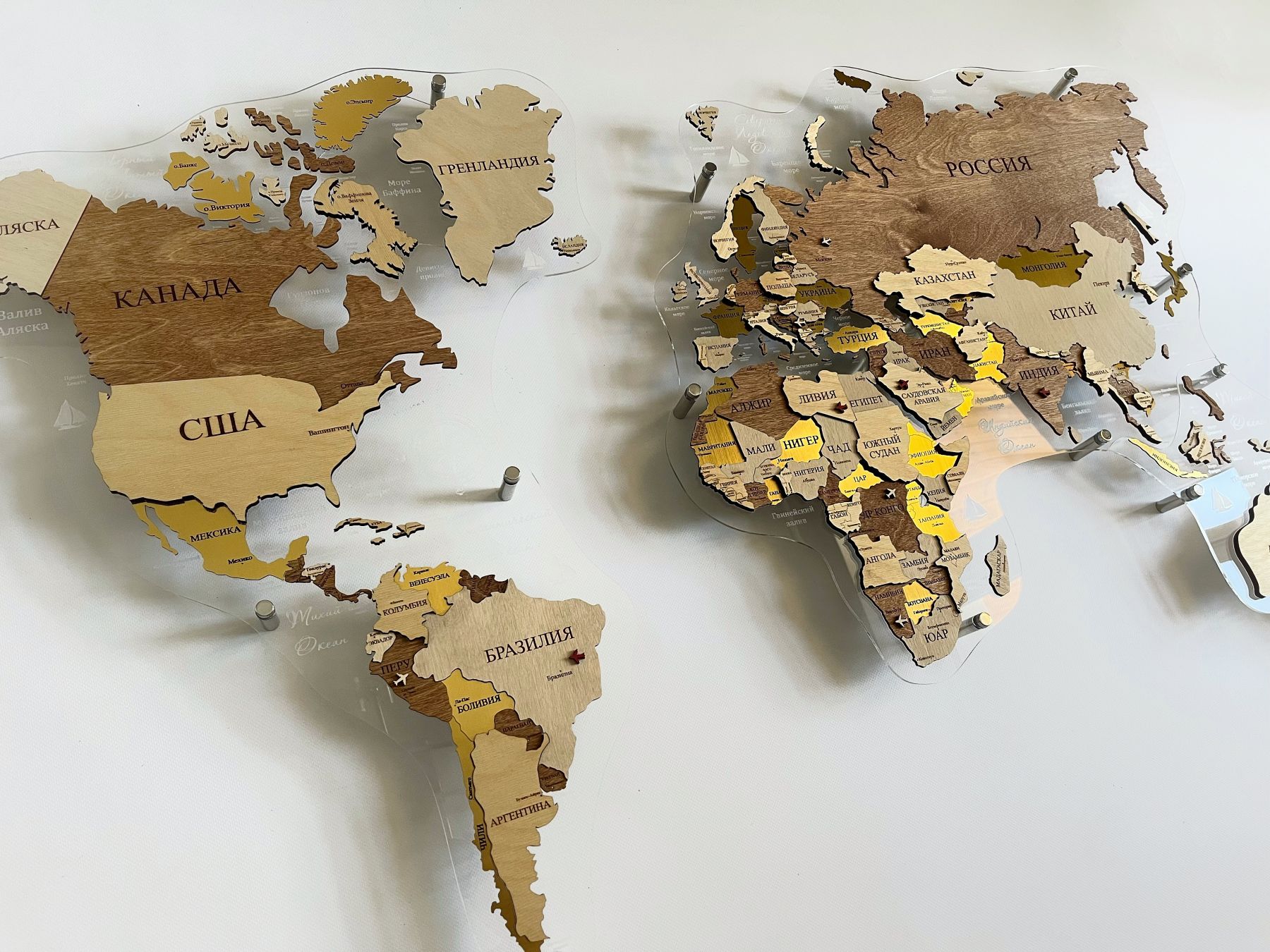- деревянная карта мира на подложке из акрилового стекла - 1 шт (карта состоит из 3-5 крупных деталей, острова уже приклеены на подложку);