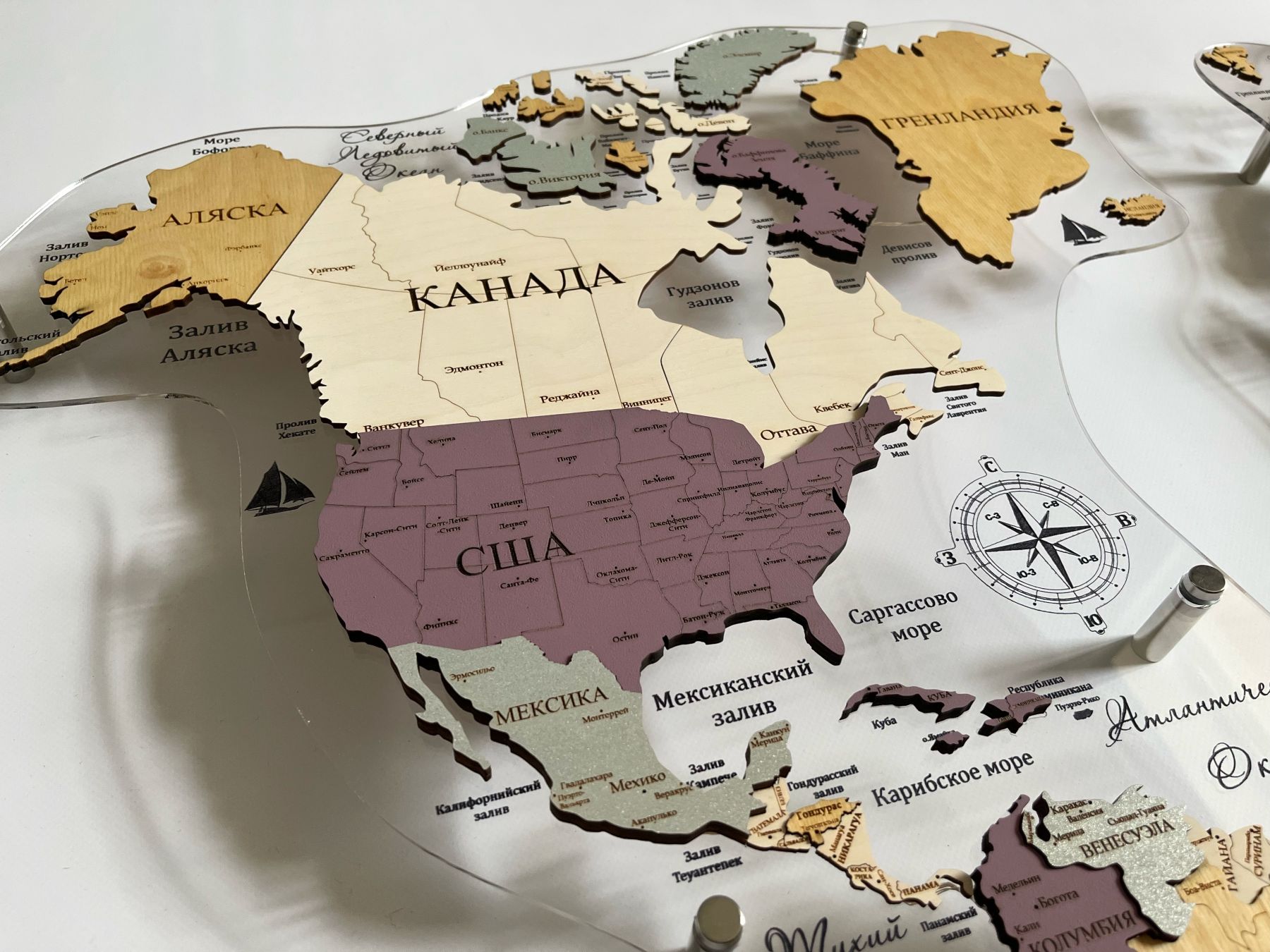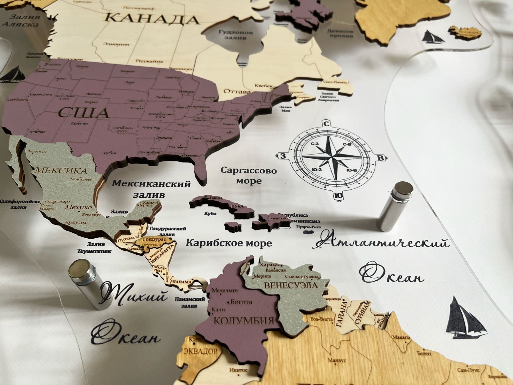 - На подложке выгравированы названия океанов, морей, заливов, бухт, проливов, а также декоративные элементы (компас, корабли), придающие карте особый шарм.