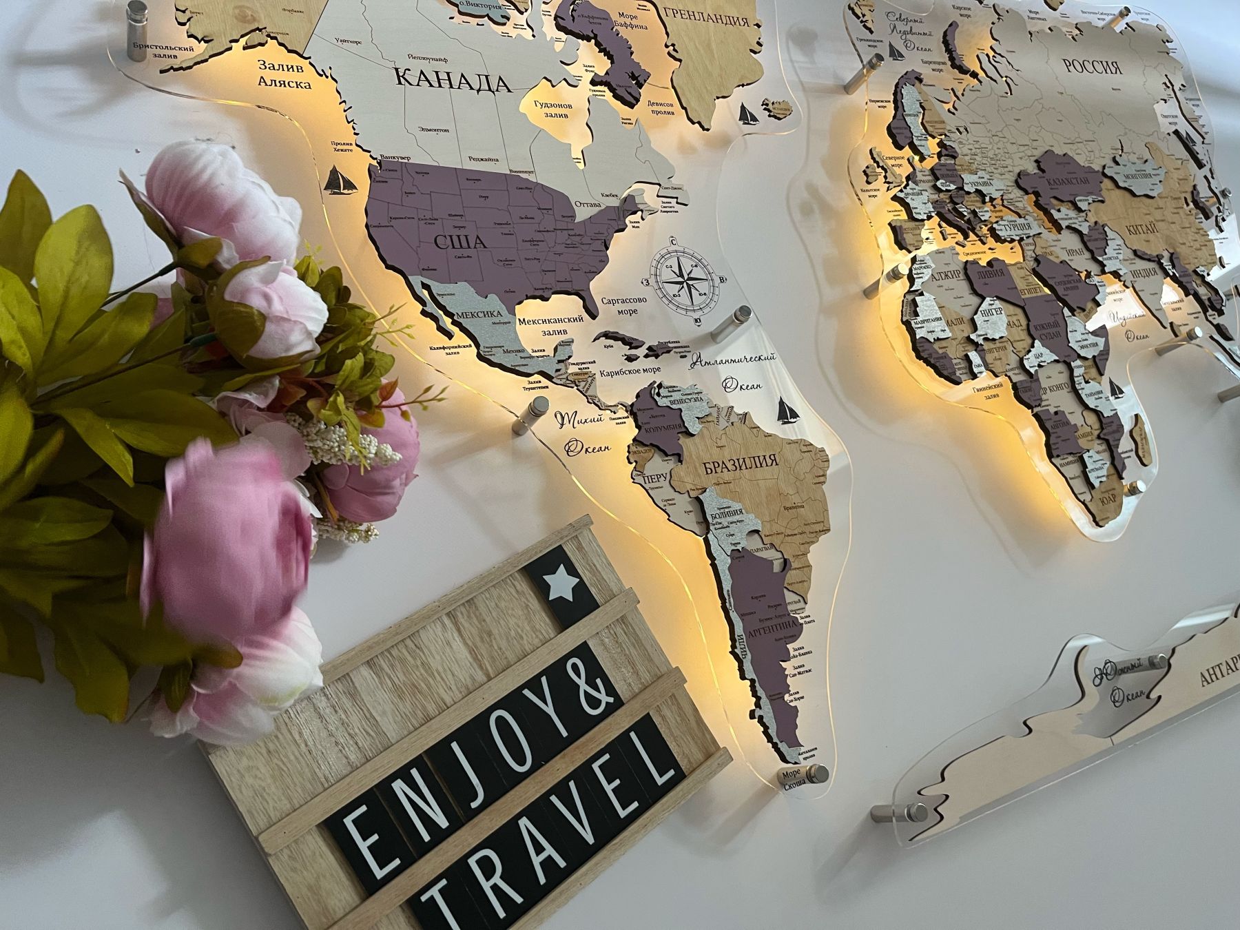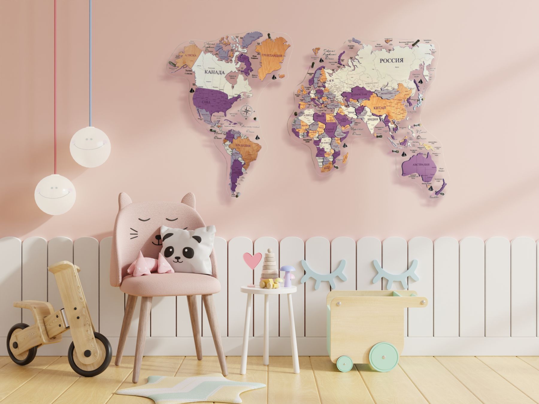 Такая карта станет отличным подарком любителю путешествий, украсит детскую комнату и поможет интереснее познавать мир, станет стильным акцентом офисного помещения.