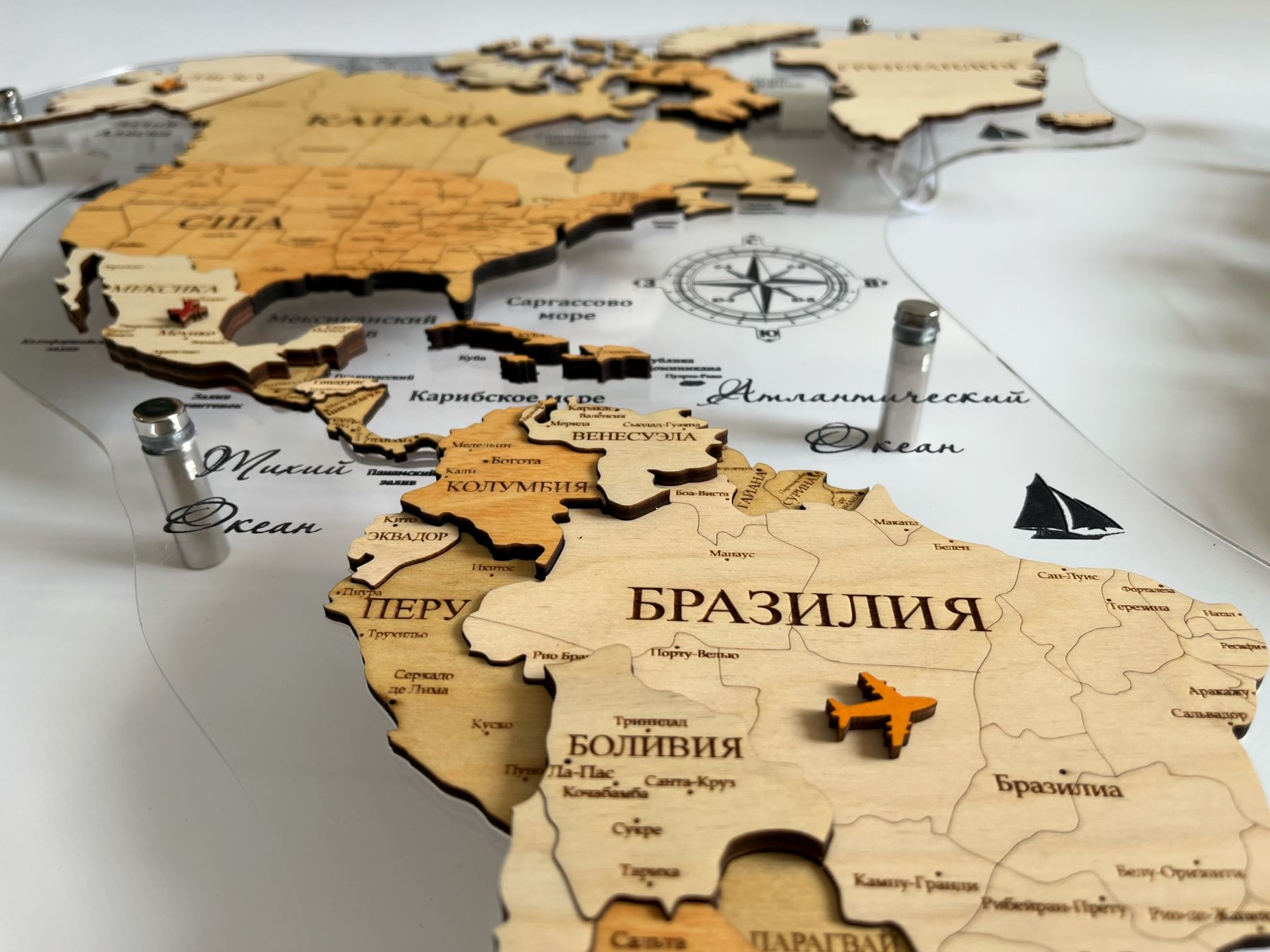 - деревянная карта мира на подложке из акрилового стекла - 1 шт (карта состоит из 3-5 крупных деталей, острова уже приклеены на подложку);