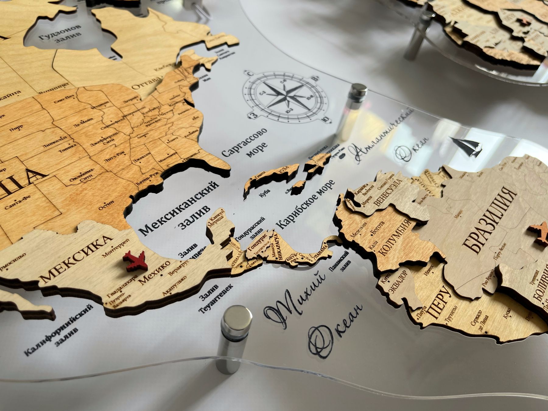 - На подложке выгравированы названия океанов, морей, заливов, бухт, проливов, а также декоративные элементы (компас, корабли), придающие карте особый шарм. Стандартный цвет гравировки - БЕЛЫЙ. В разделе каталога "Товары к картам" Вы можете добавить опцию "Покраска гравировки на орг.стекле в черный цвет".