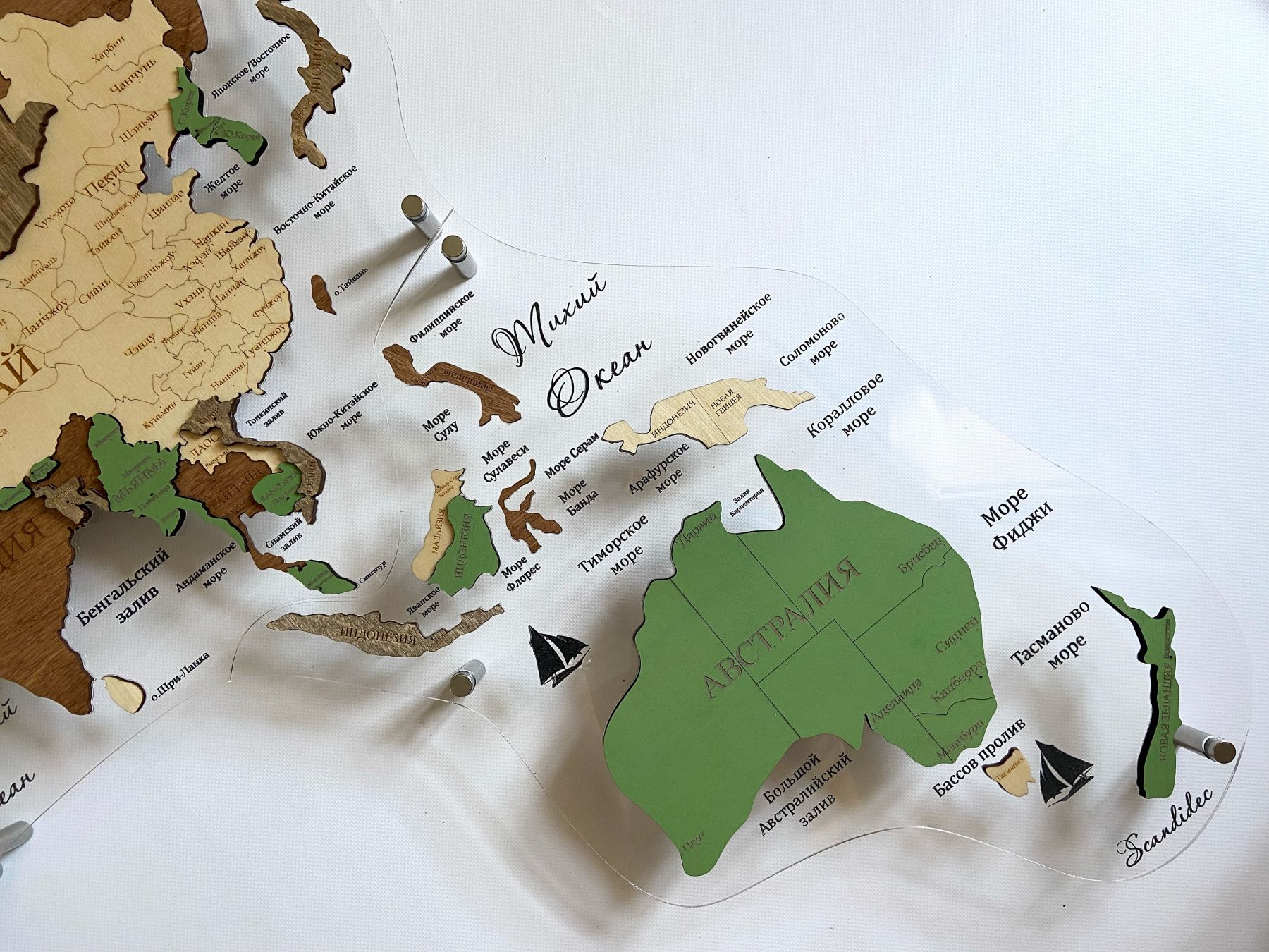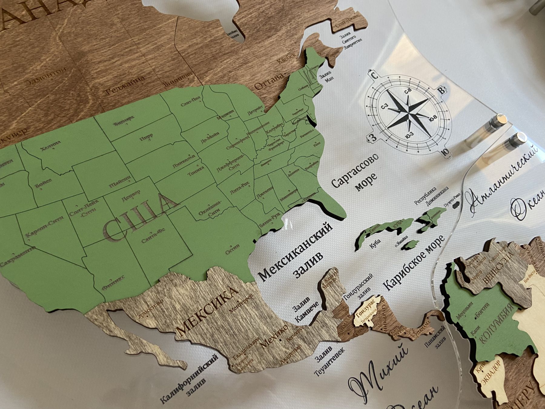 - деревянная карта мира на подложке из акрилового стекла - 1 шт (карта состоит из 3-5 крупных деталей, острова уже приклеены на подложку);