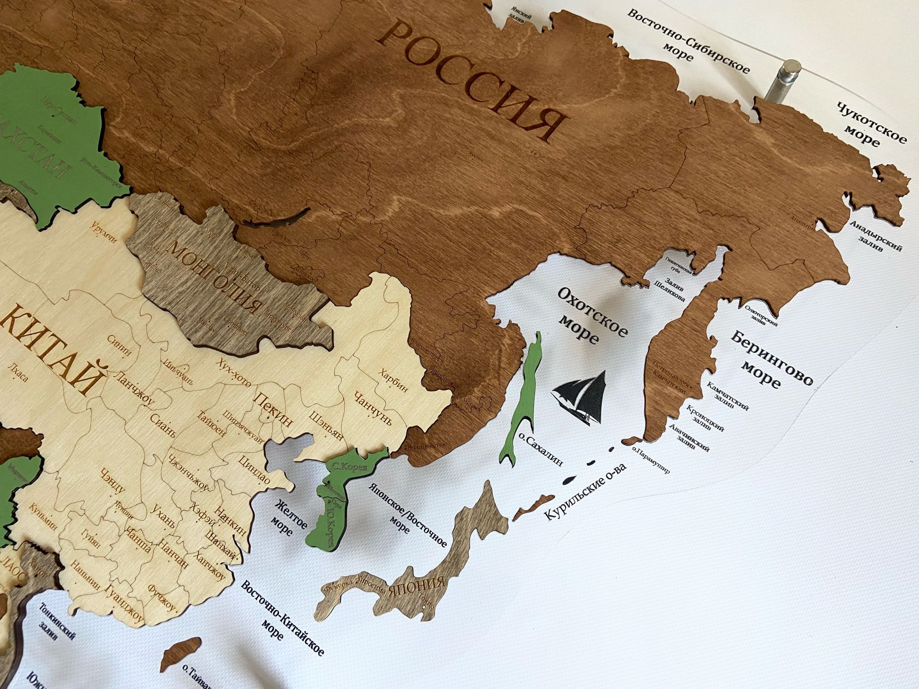 - Материал карты - натуральный берёзовый шпон разной толщины, от 3 до 8 мм. Покрытие - экологичная морилка на водной основе.