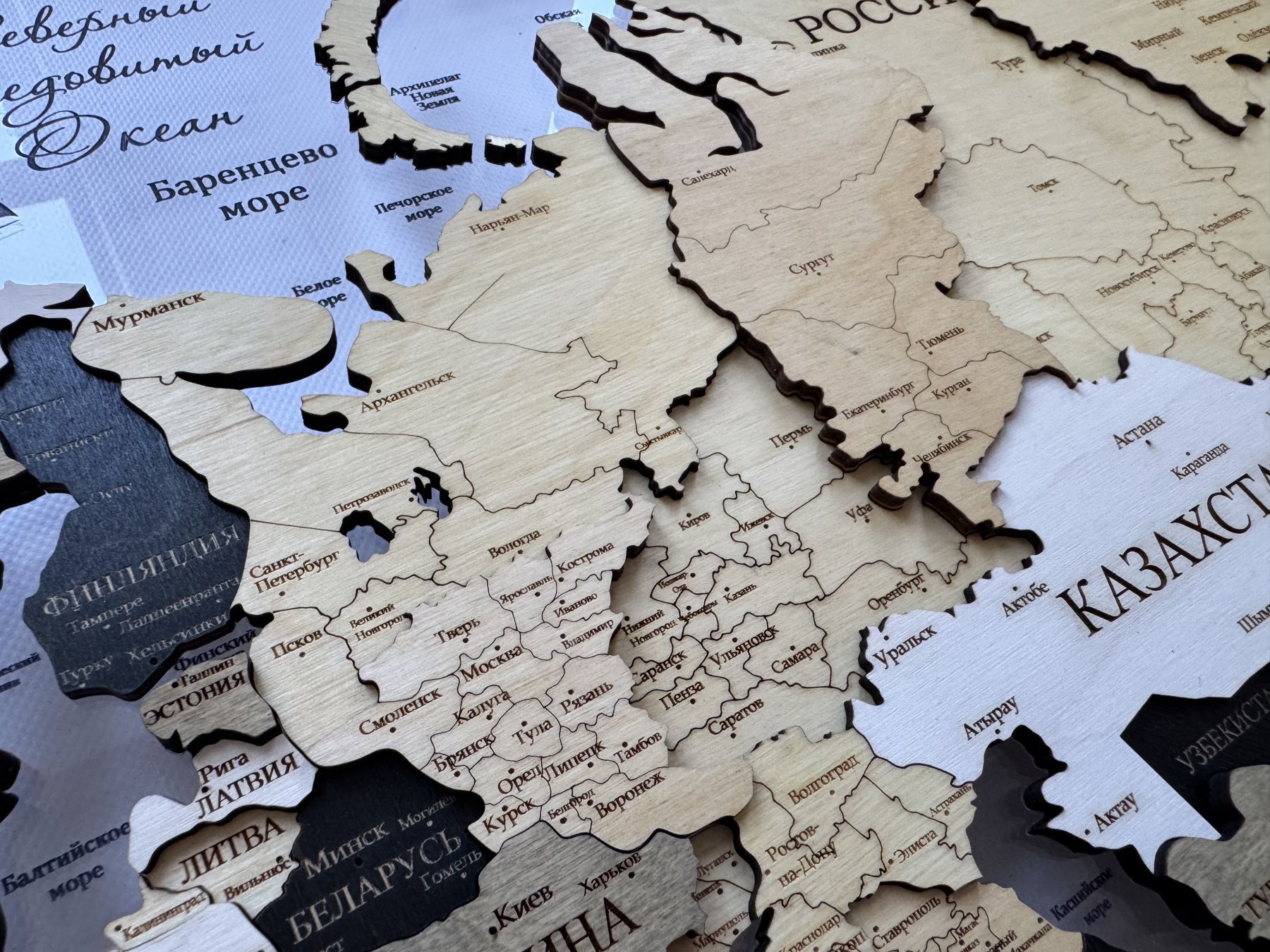 Все детали карты вырезаются на высокоточном лазерном оборудовании, что гарантирует идеальные линии и качество. Затем детали окрашиваются, тщательно шлифуются несколько раз и склеиваются вручную, бережно, с вниманием к деталям.
