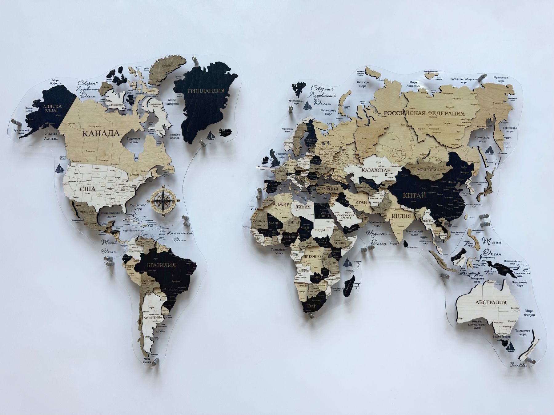 - На подложке выгравированы названия океанов, морей, заливов, бухт, проливов, а также декоративные элементы (компас, корабли), придающие карте особый шарм. Стандартный цвет гравировки - БЕЛЫЙ. В разделе каталога "Товары к картам" Вы можете добавить опцию "Покраска гравировки на орг.стекле в черный цвет".
