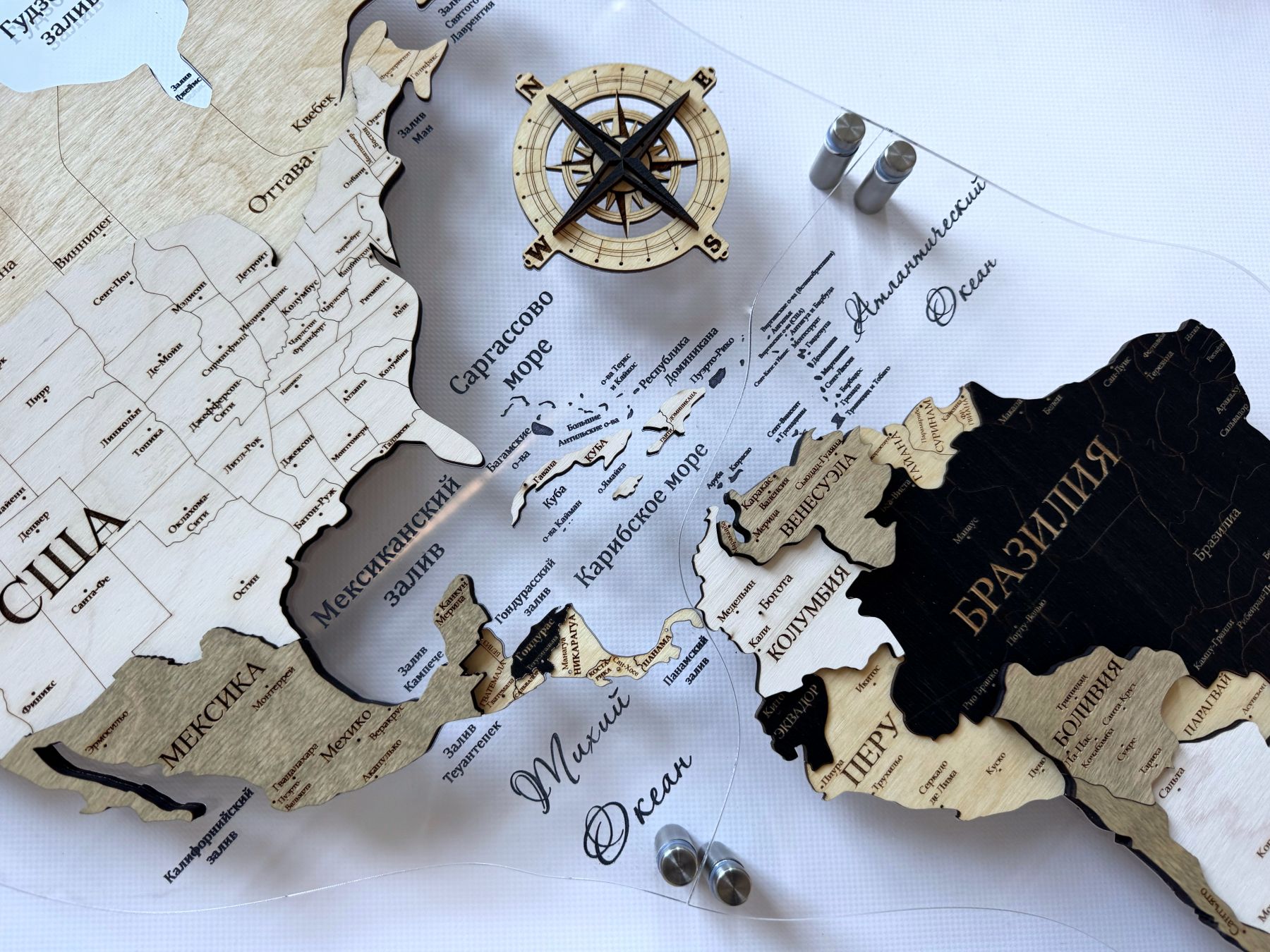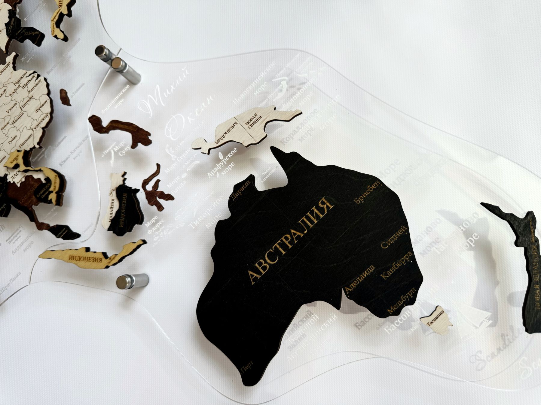 - деревянная карта мира на подложке из акрилового стекла - 1 шт (карта состоит из 3-5 крупных деталей, острова уже приклеены на подложку);