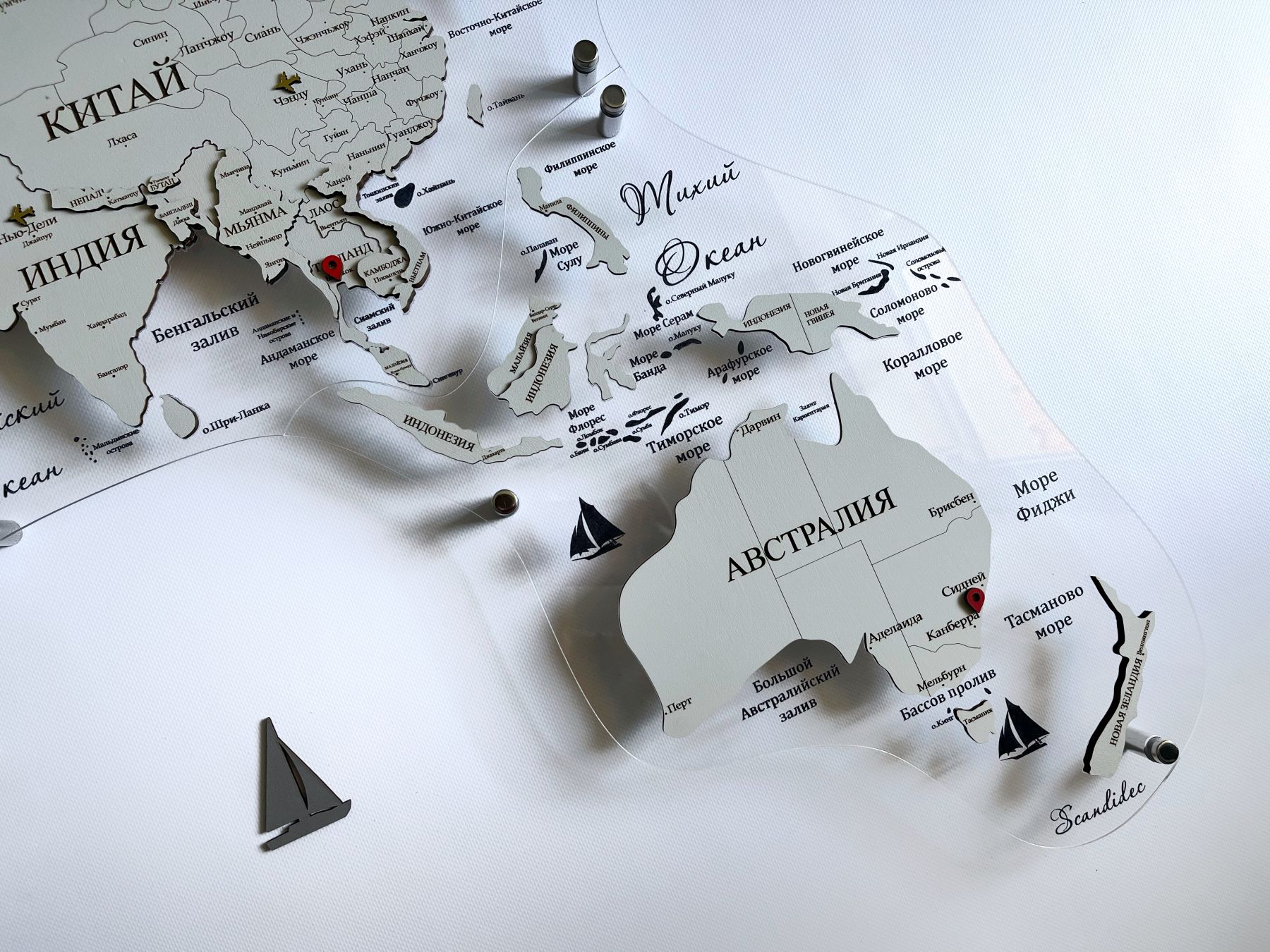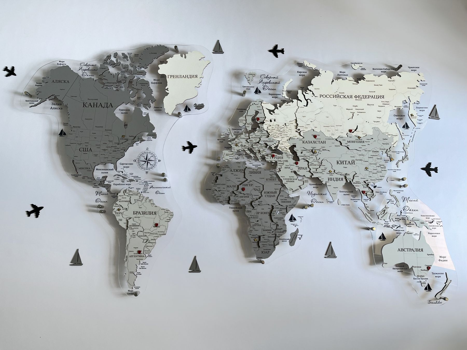 - На подложке выгравированы названия океанов, морей, заливов, бухт, проливов, а также декоративные элементы (компас, корабли), придающие карте особый шарм. Вы можете выбрать цвет гравировки - белый (подойдет для темных стен, для цветных стен), либо черный (для белых или светлых стен).