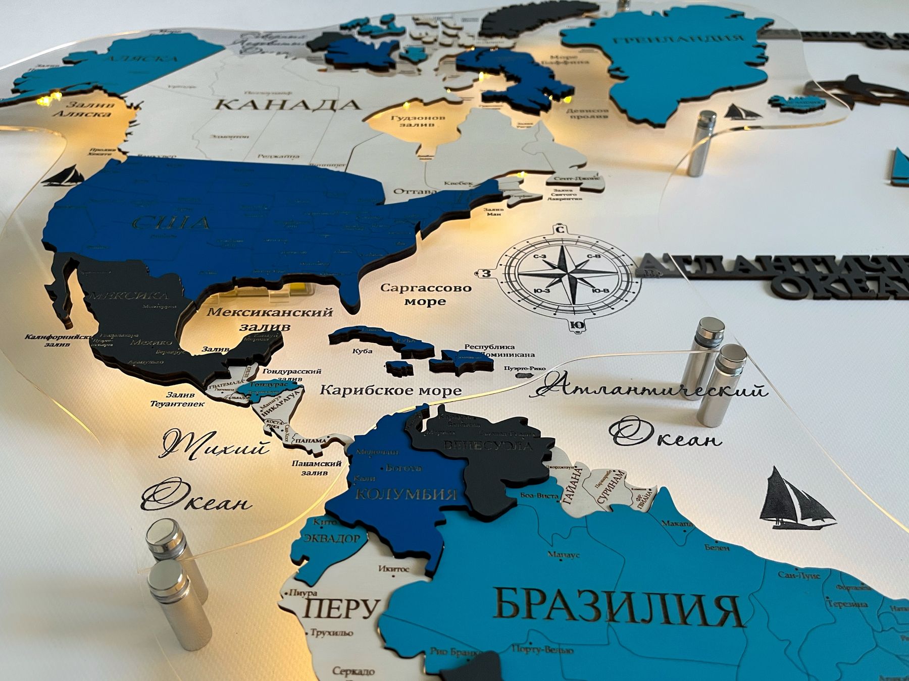 - На подложке выгравированы названия океанов, морей, заливов, бухт, проливов, а также декоративные элементы (компас, корабли), придающие карте особый шарм. Стандартный цвет гравировки - БЕЛЫЙ. В разделе каталога "Товары к картам" Вы можете добавить опцию "Покраска гравировки на орг.стекле в черный цвет".