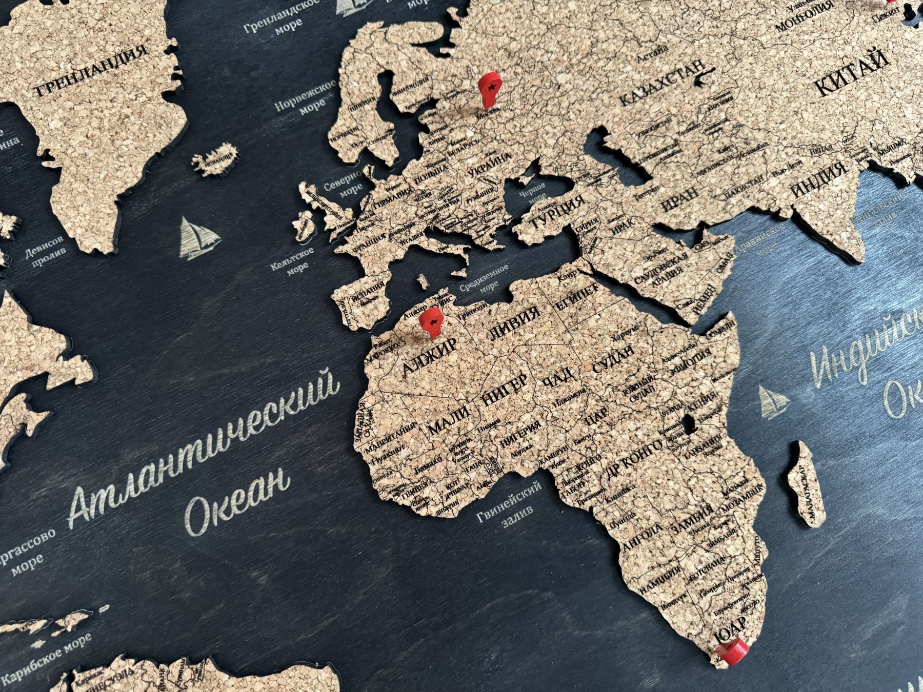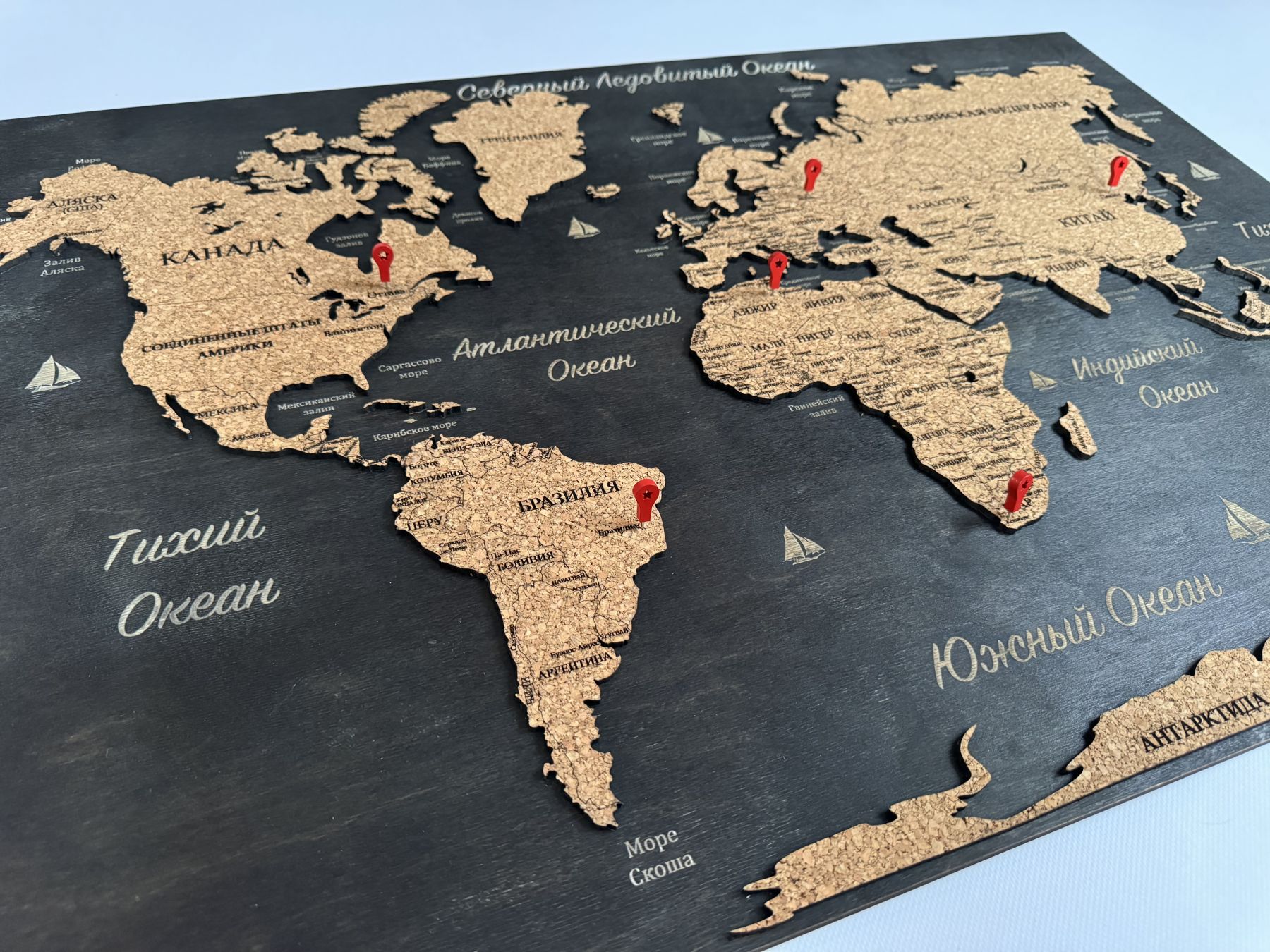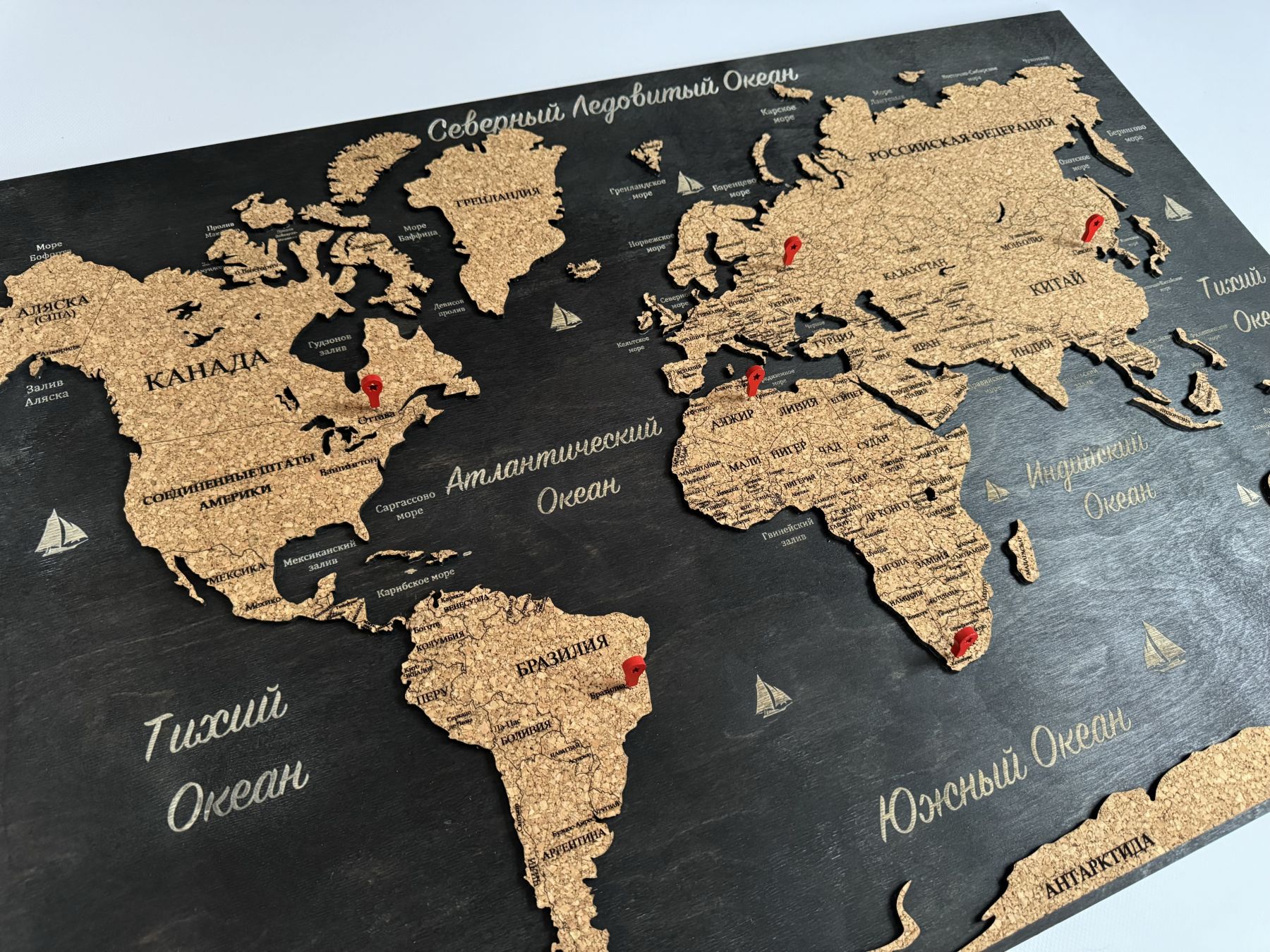 Стильная небольшая карта мира из пробки, на деревянной подложке, 80х60 см, станет отличным вариантов корпоративного подарка для сотрудников или бизнес-партнеров.