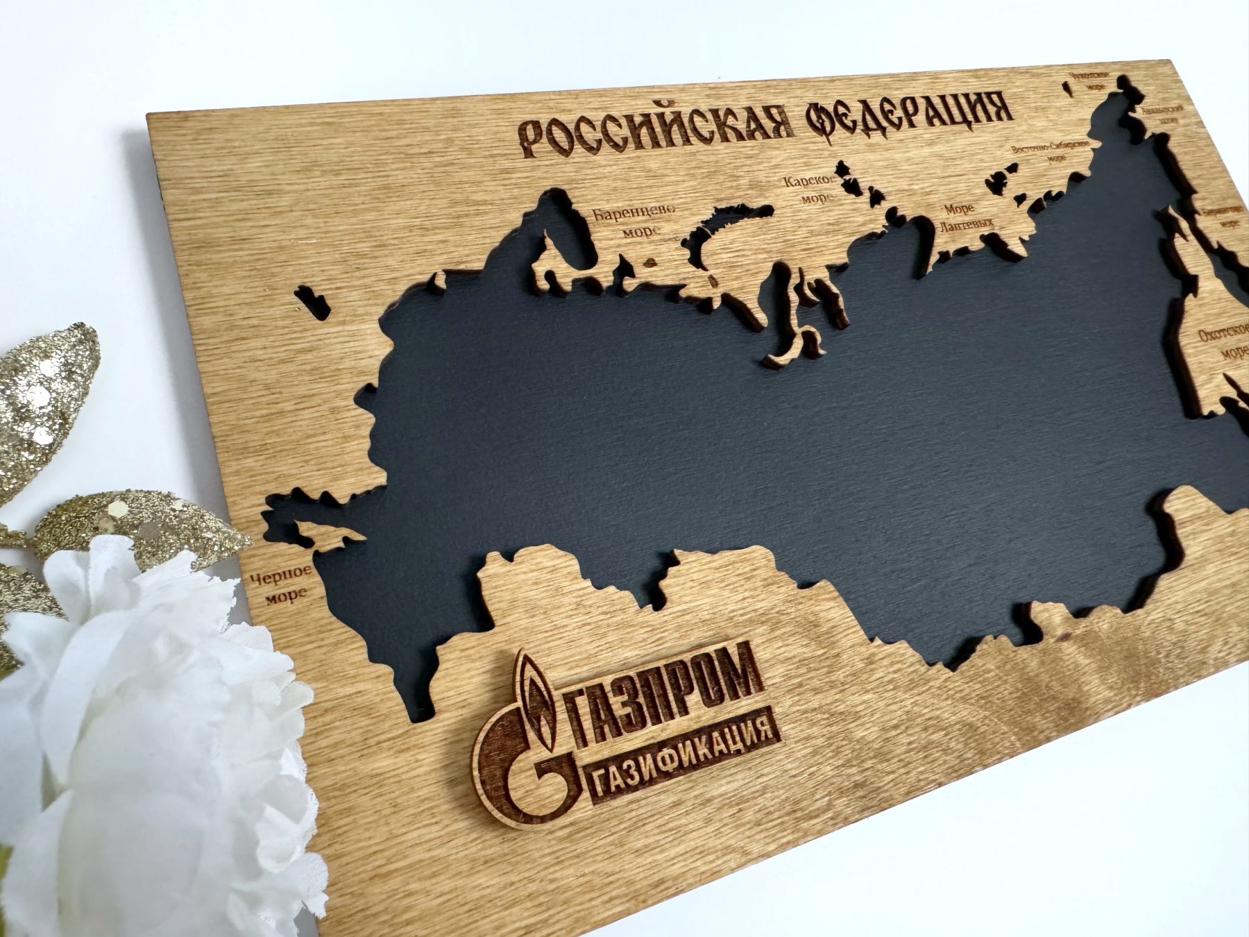 Стильная мини-карта России из дерева, на подложке из дерева, формата А4 станет отличным вариантов корпоративного подарка для сотрудников или бизнес-партнеров.