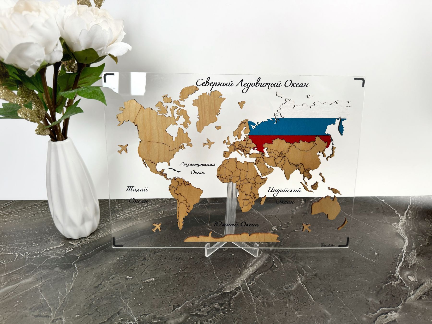 Настольная мини-карта мира из дерева, c акцентной Россией, на стеклянной подложке