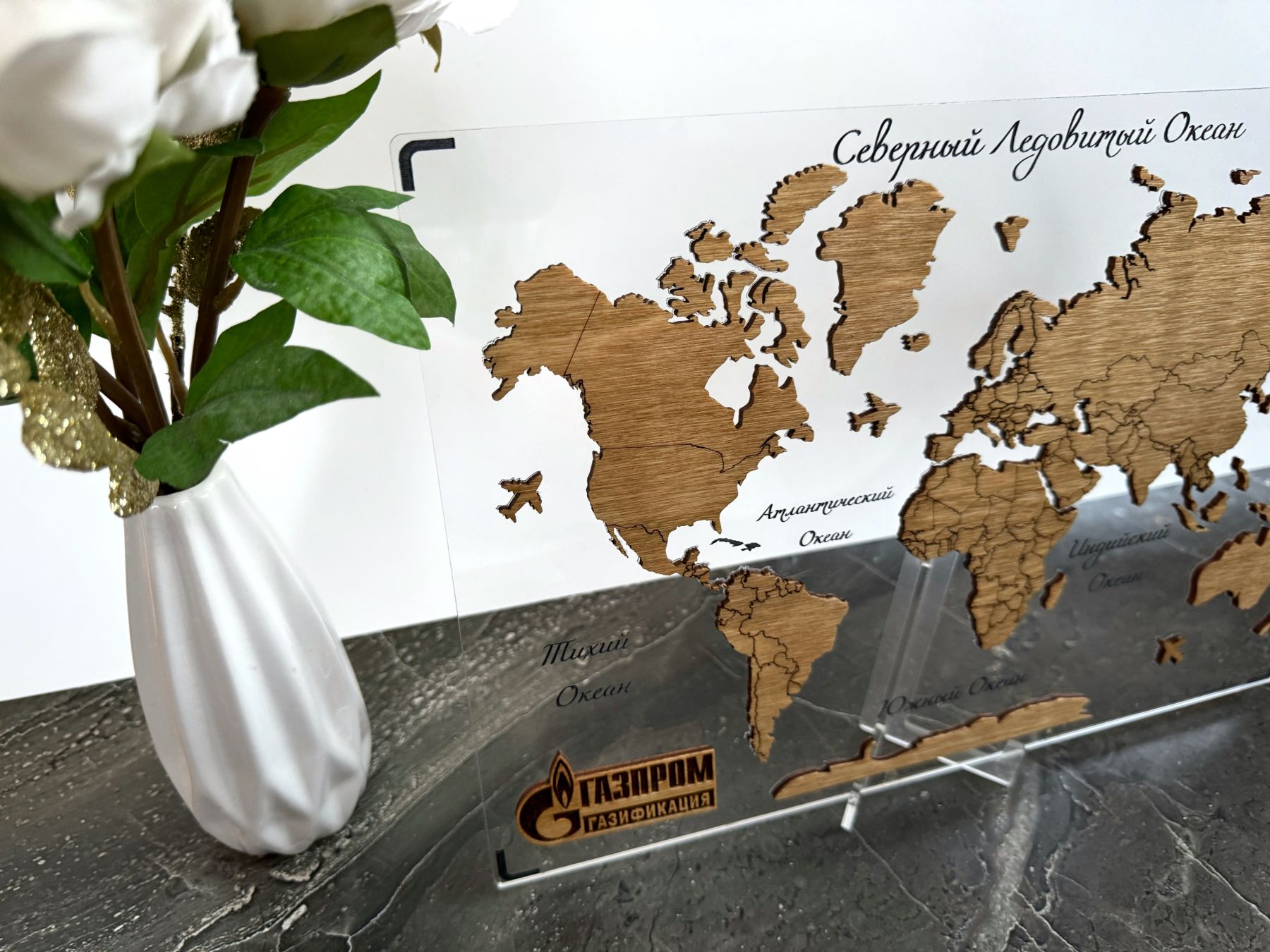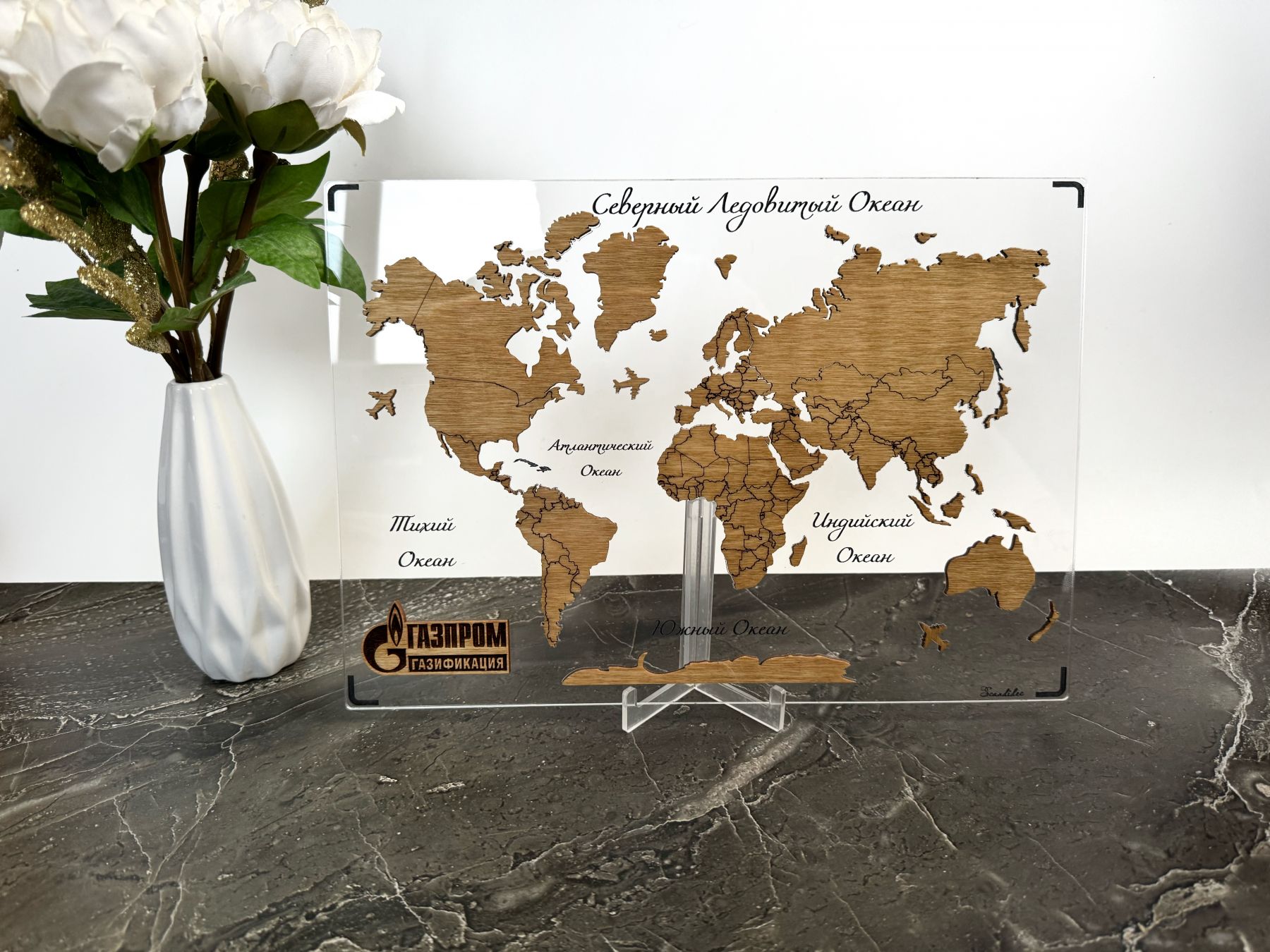 Стильный и оригинальный аксессуар для рабочего стола - мини-карта мира из дерева, на подложке из орг.стекла, с возможностью добавления логотипа компании.